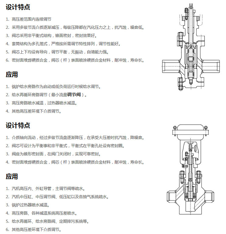 ZHD電子式電動(dòng)多級(jí)調(diào)節(jié)閥采用的是多級(jí)籠式套筒閥芯或軸流迷宮型閥芯,多級(jí)減壓,完全控制流過閥內(nèi)的介質(zhì)的流速,大幅度的降低了高壓氣體或者蒸汽在閥內(nèi)產(chǎn)生的噪音,穩(wěn)定的多級(jí)別降壓有效使液體不會(huì)產(chǎn)生氣蝕,是使用在高壓介質(zhì)場(chǎng)所性能穩(wěn)定的控制閥,可選擇多彈簧氣動(dòng)薄膜機(jī)構(gòu)或電動(dòng)執(zhí)行機(jī)構(gòu)等。