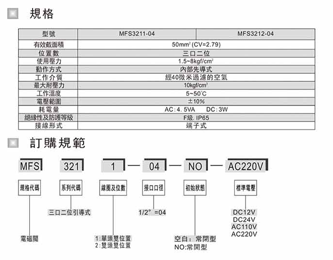 電磁閥 MFS3211-01-NO-DC12V,MFS3211-01-NO-DC24V,MFS3211-01-NO-AC110V,MFS3211-01-NO-AC220V
