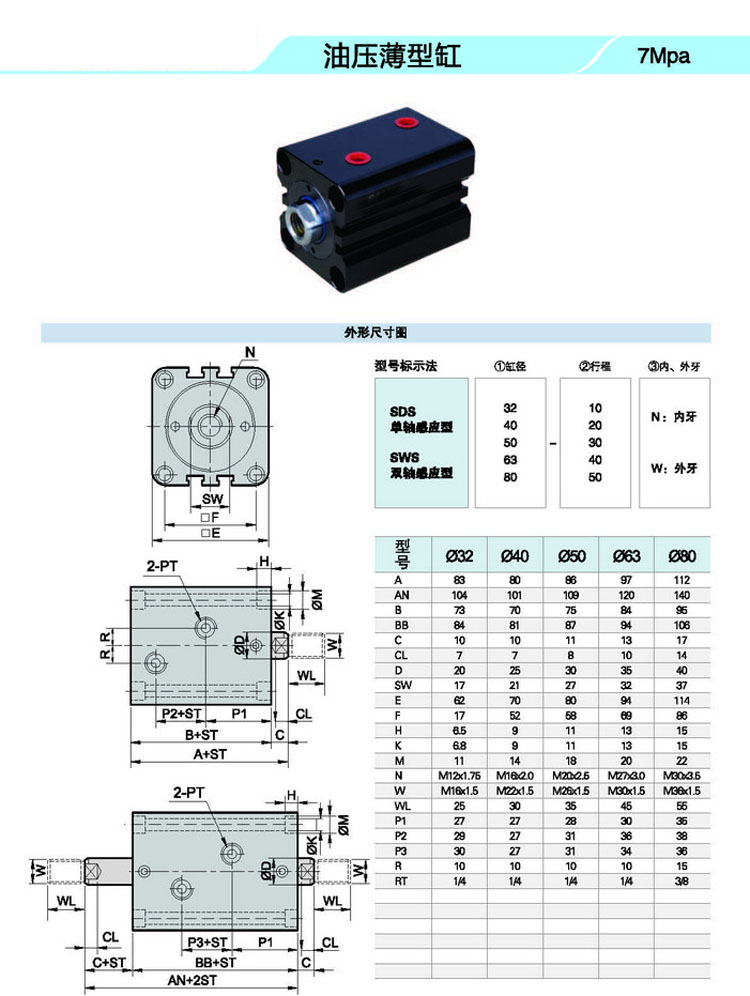 SDS32-10,SDS40-10,SDS50-10,SDS63-10,SDS80-10,SWS32-10,SWS40-10,SWS50-10,SWS63-10,SWS80-10,油壓薄型缸