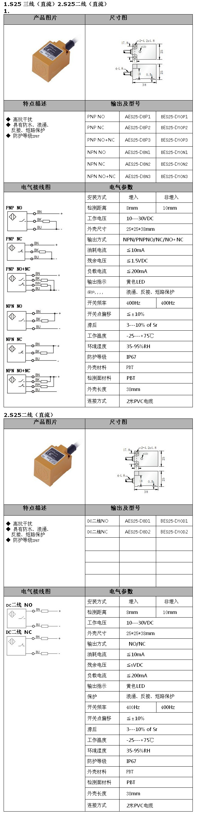 AES25-D8P1,BES25-D10P2,BES25-D10P3,BES25-D10N2,AES25-D8D2,BES25-D10D2,S25直流三二線接近開關(guān)