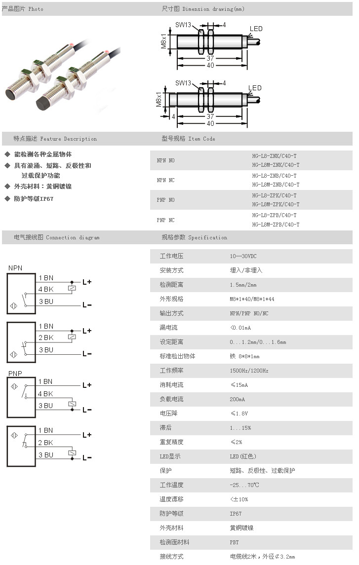 詳細信息 防水/防油/防腐蝕接近開關 HG-L8-ZNK/C40-T,HG-L8M-ZNK/C40-T,HG-L8-ZNB/C40-T,HG-L8M-ZNB/C40-T,HG-L8-ZPK/C40-T,HG-L8M-ZPK/C40-T,HG-L8-ZPB/C40-T,HG-L8M-ZPB/C40-T,