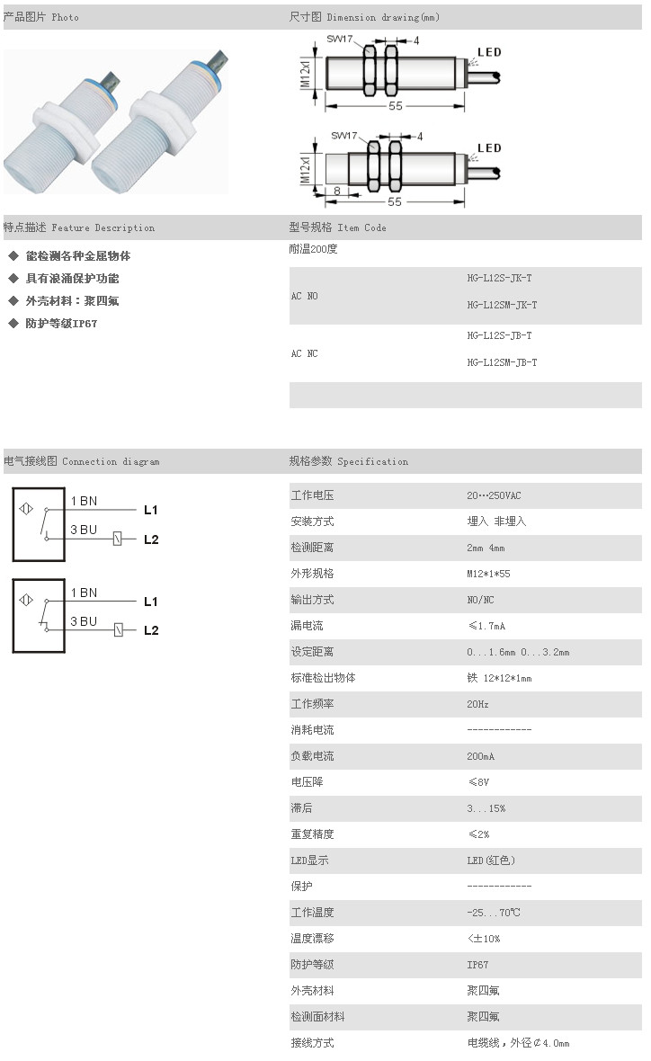 詳細(xì)信息 防水/防油/防腐蝕接近開關(guān) HG-L12S-JK-T,HG-L12SM-JK-T,HG-L12S-JB-T,HG-L12SM-JB-T,
