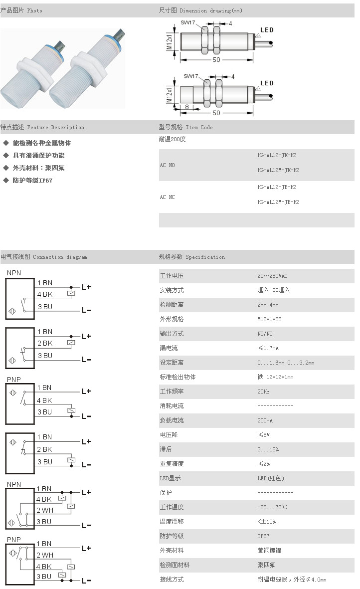 耐高溫接近開關(guān)(低溫) HG-WL12-JK-H2,HG-WL12M-JK-H2,HG-WL12-JB-H2,HG-WL12M-JB-H2,