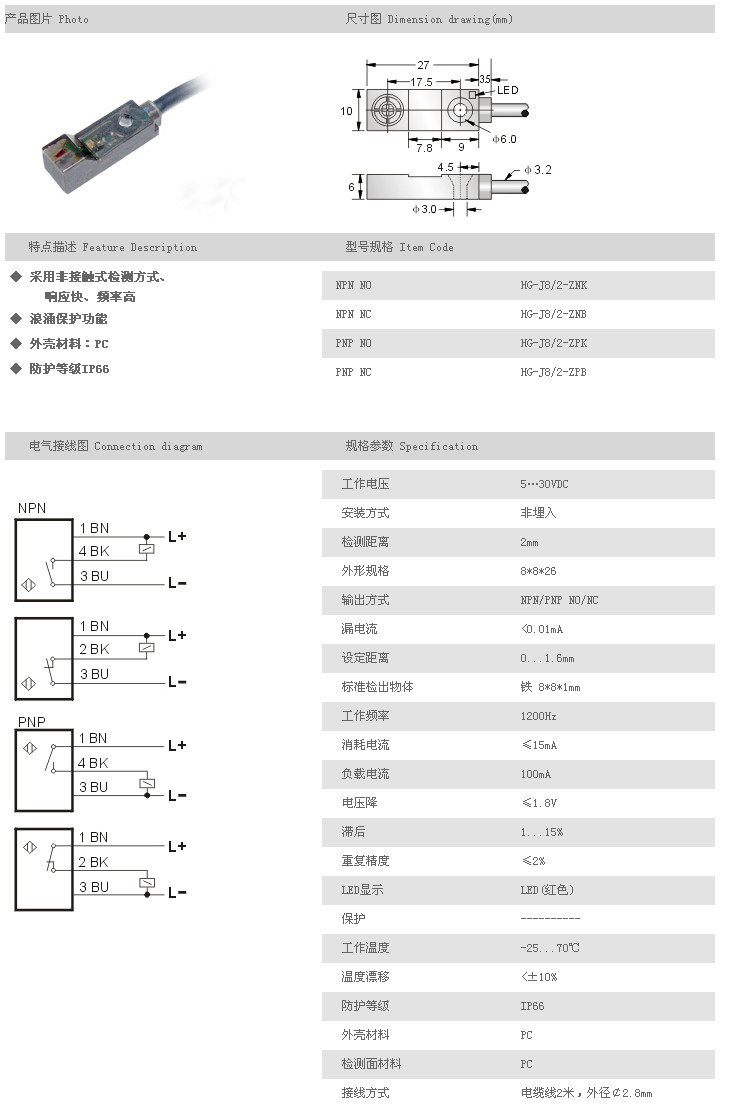 超小型接近開關(guān) HG-J8/2-ZNK,HG-J8/2-ZNB,HG-J8/2-ZPK,HG-J8/2-ZPB,