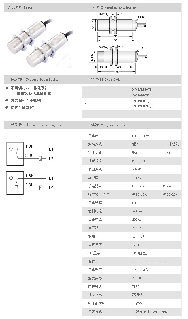 金屬探頭型接近開關(guān) HG-JSL18-JK,HG-JSL18M-JK,HG-JSL18-JB,HG-JSL18M-JB,