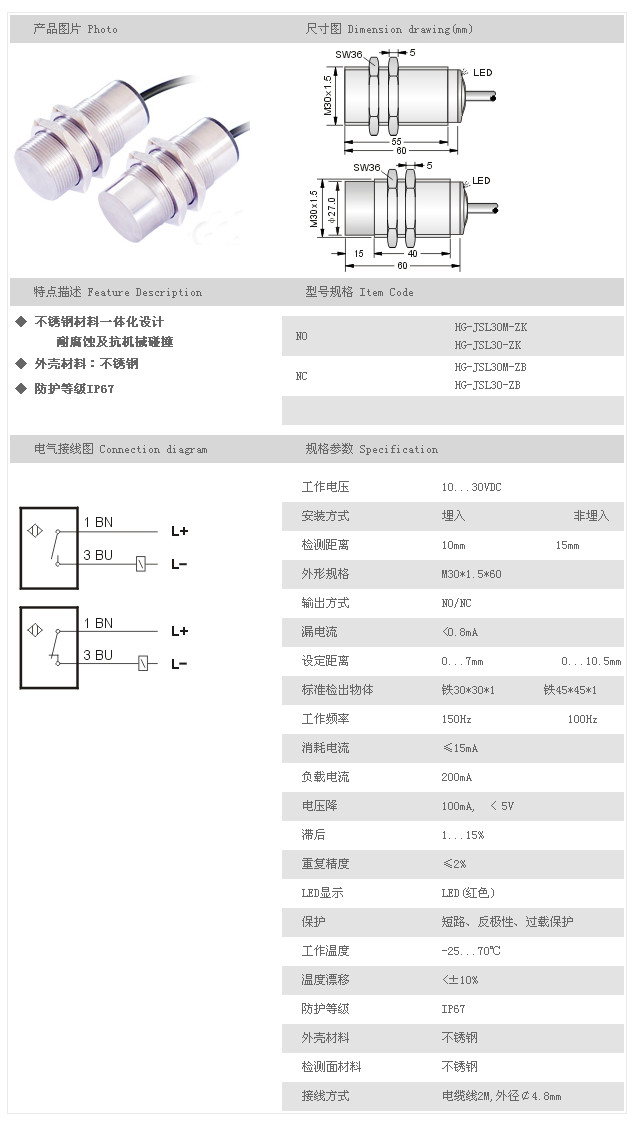 金屬探頭型接近開關(guān) HG-JSL30M-ZK,HG-JSL30-ZK,HG-JSL30M-ZB,HG-JSL30-ZB,