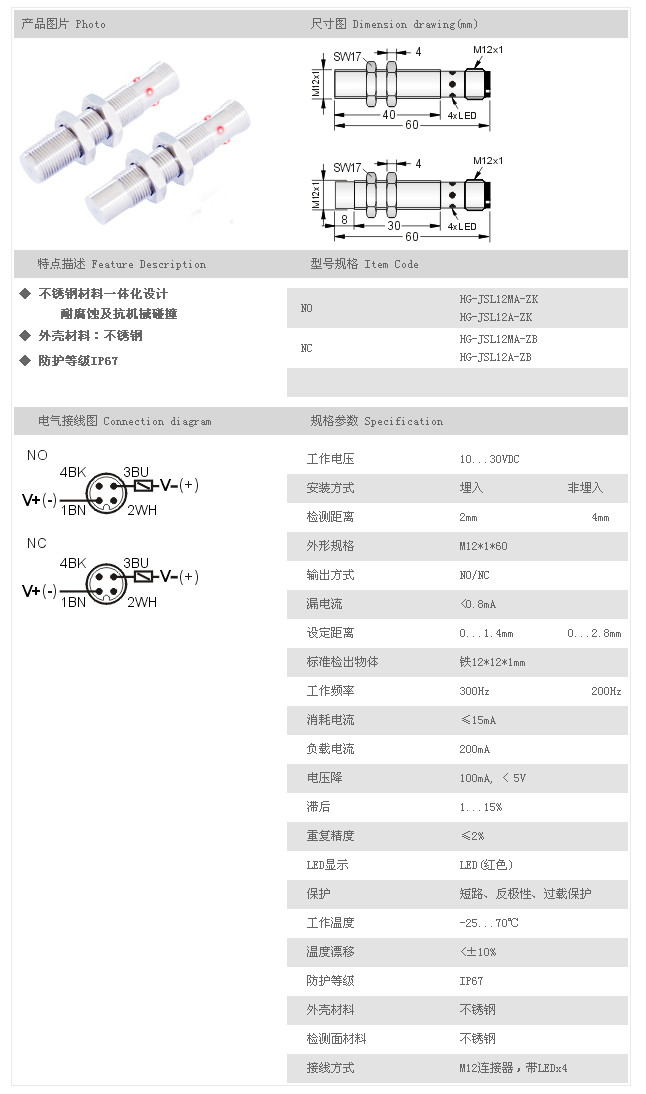 金屬探頭型接近開關(guān) HG-JSL12MA-ZK,HG-JSL12A-ZK,HG-JSL12MA-ZB,HG-JSL12A-ZB,