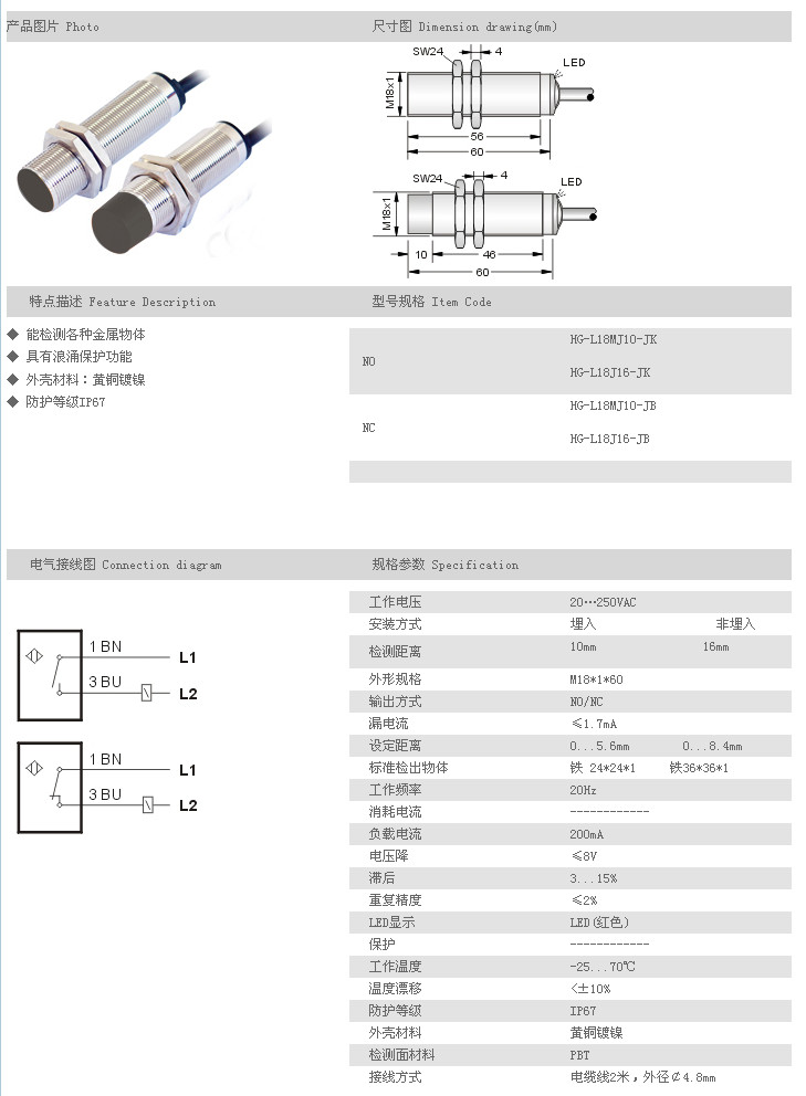 遠距離型接近開關 HG-L18MJ10-JK,HG-L18J16-JK,HG-L18MJ10-JB,HG-L18J16-JB,