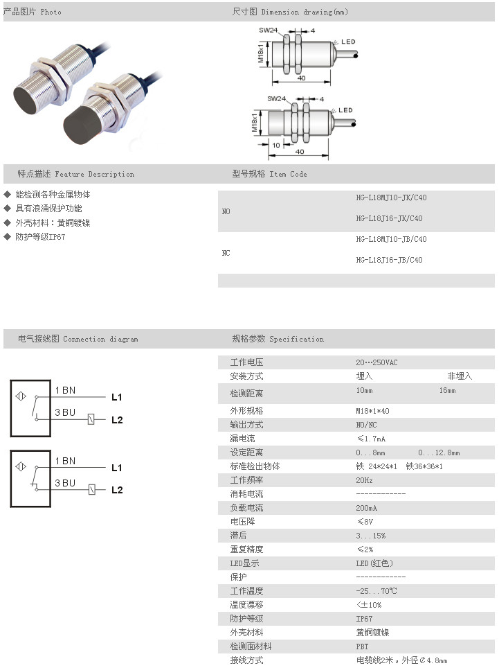 遠距離型接近開關 HG-L18MJ10-JK/C40,HG-L18J16-JK/C40,HG-L18MJ10-JB/C40,HG-L18J16-JB/C40,