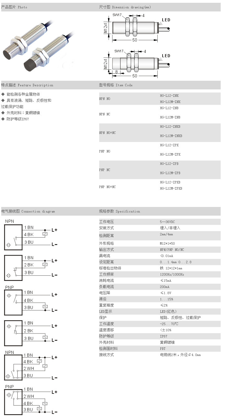 L12圓柱型接近開關(guān) HG-L12-ZNK,HG-L12M-ZNK,HG-L12-ZNB,HG-L12M-ZNB,HG-L12-ZNKB,