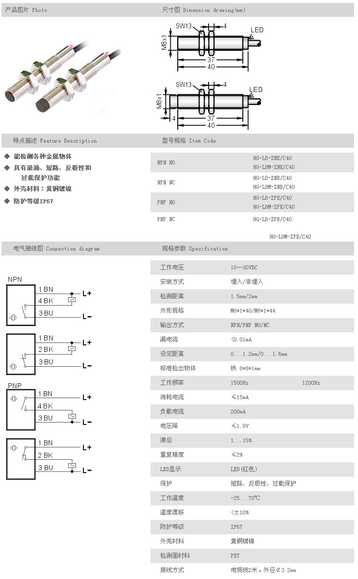 L8圓柱型接近開關(guān) HG-L8-ZNK/C40,HG-L8M-ZNK/C40,HG-L8-ZNB/C40,HG-L8M-ZNB/C40,