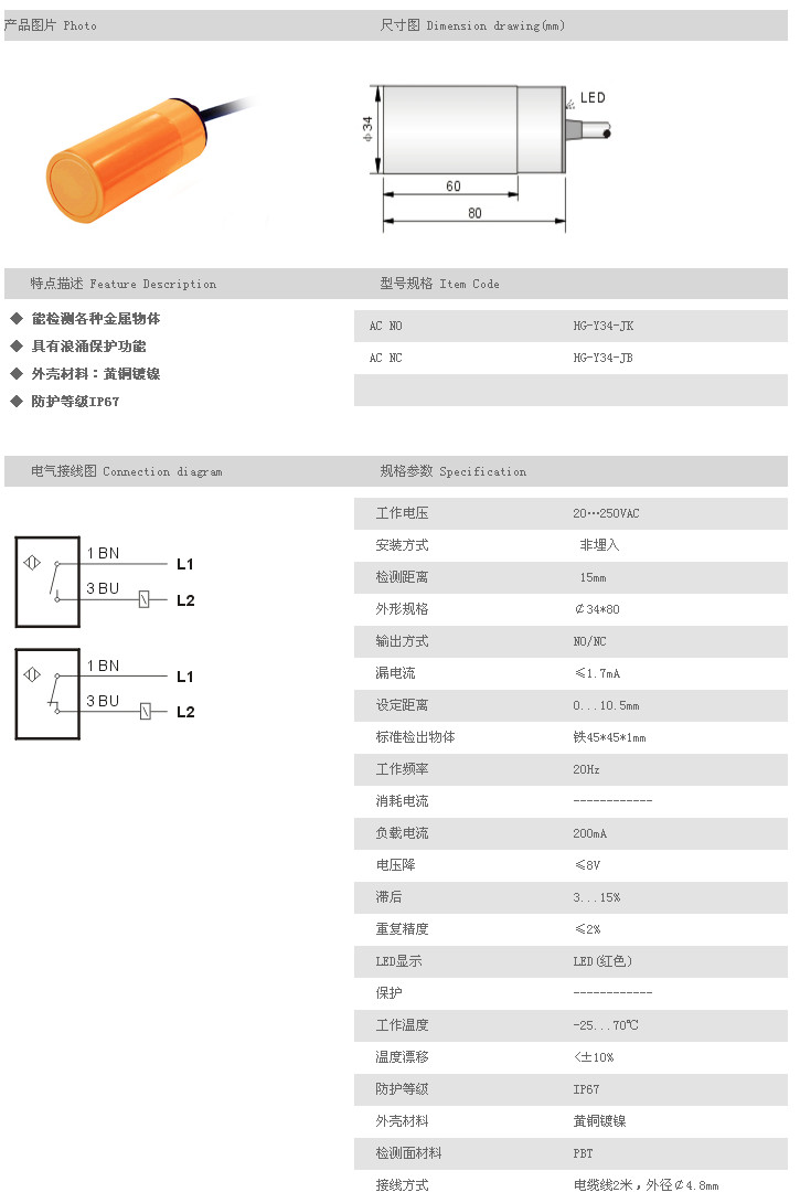 Y34圓柱型接近開關(guān) HG-Y34-JK,HG-Y34-JB,