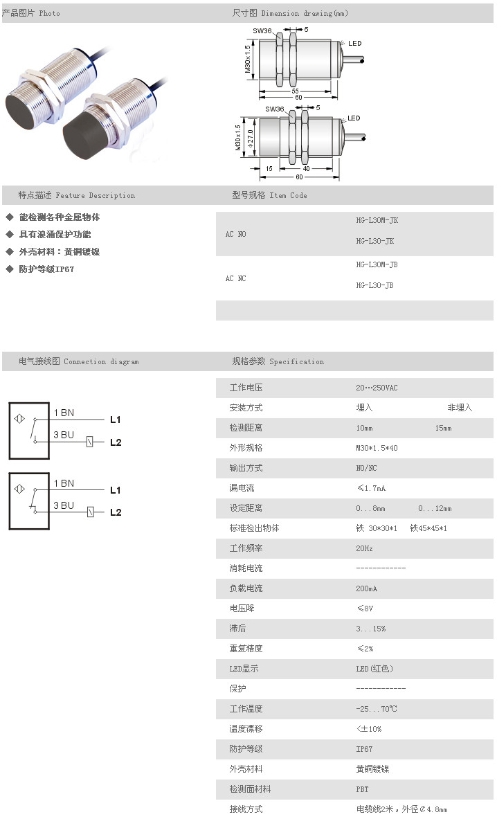 L30圓柱型接近開關(guān) HG-L30-JK,HG-L30M-JK,HG-L30-JB,HG-L30M-JB,