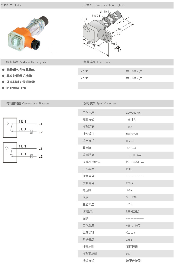 L18ZA圓柱型接近開(kāi)關(guān) HG-L18ZA-JK,HG-L18ZA-JB,