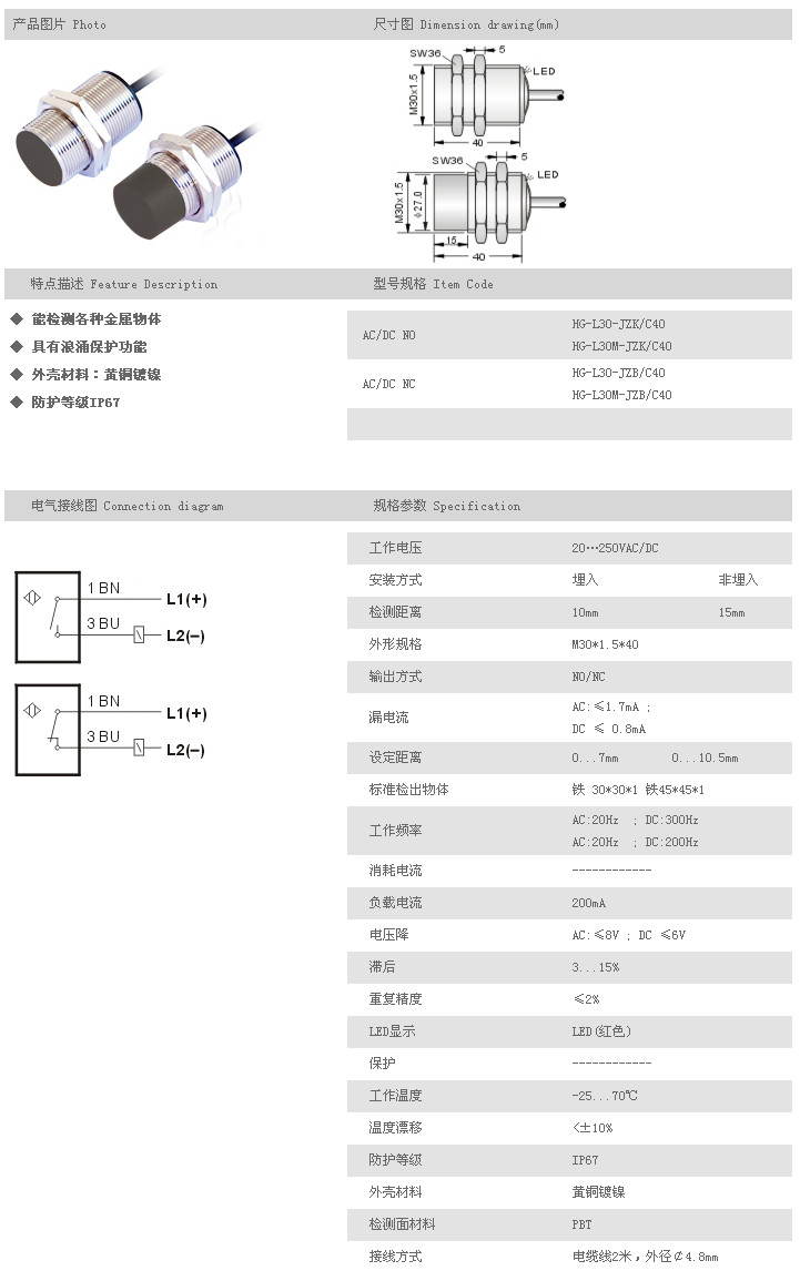 L30短圓柱型接近開關 HG-L30-JZK/C40,HG-L30M-JZK/C40,HG-L30-JZB/C40,HG-L30M-JZB/C40,