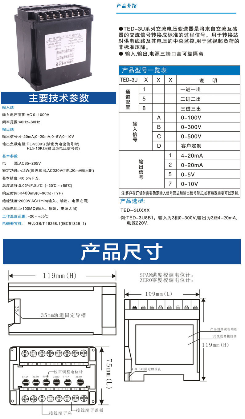 TED-3U1A1,TED-3U1C2,TED-3U1D7,TED-3U5A5,TED-3U8B1,TED-3U8D2,TED-3U,交流電壓變送器