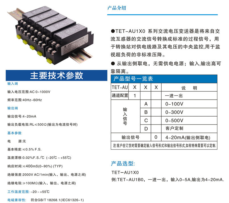 TET-AU1A0,TET-AU1B0,TET-AU1C0,TET-AU1D0,TET-AU1X0,交流電壓變送器