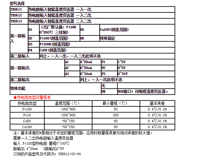 測量范圍: 見選型訂貨欄目中的“熱電阻分度號及量程表”