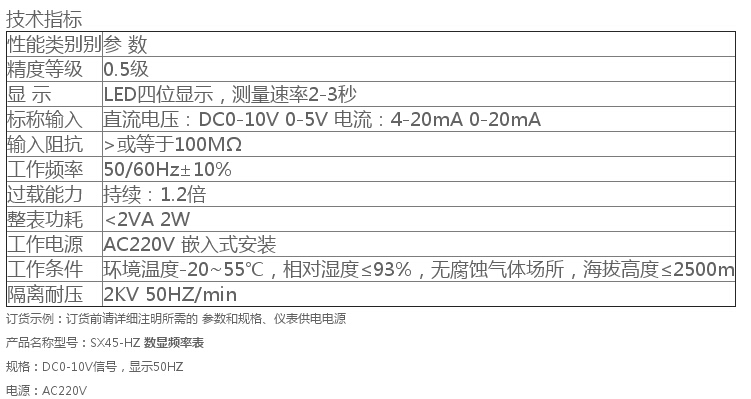 SX45-HZ變頻器專用數(shù)顯頻率表,通過測量變頻器輸出的DC0-10V 0-5V或0-20mA,模擬量信號(hào),來顯示變頻器輸出的轉(zhuǎn)速或頻率。適用于機(jī)械設(shè)備.機(jī)電設(shè)備.自動(dòng)化設(shè)備.變頻器控制柜等,是變頻器配套使用