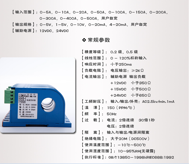 GE703X-AI穿孔電流變送器 輸入范圍:AC0-5A、10A、20A、30A、50A、