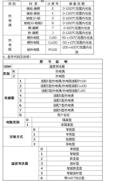 輸入信號:熱電偶:K、E、J、B、S、T、N。熱電阻:Pt100、Cu50、Cu100(三線制、四線制)。智能型溫度變送器的輸入信號可通過手持器和PC機任意設(shè)置;