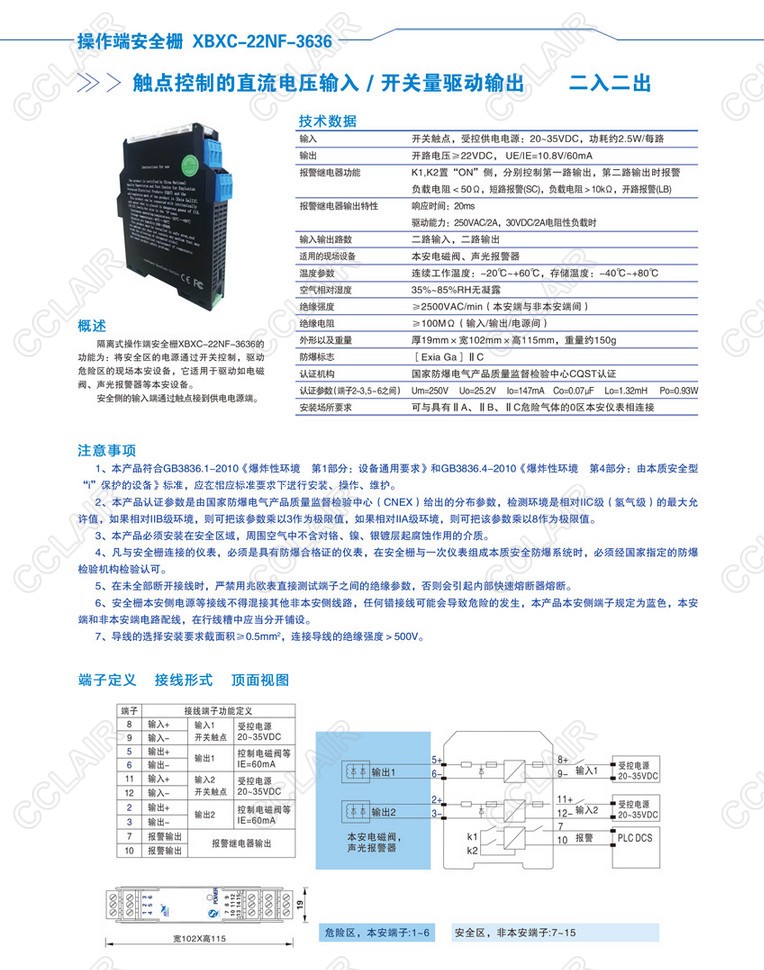 XBXC-22NF-3636,操作端安全柵開(kāi)關(guān)量驅(qū)動(dòng)輸出(二入二出)