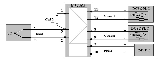 例2:輸入K型熱電偶:0~800℃;輸出一:1~5VDC, 輸出二:4~20mADC,一入兩出,則型號(hào)為MSC303-103C,0~800℃