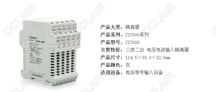 CZ3088 二進(jìn)二出 電壓電流輸入隔離器 二進(jìn)二出,支持多種電壓電流信號輸入,多種電壓電流信號輸入 可向現(xiàn)場儀表提供隔離電源 CZ3089 一進(jìn)二出 電壓電流輸入隔離器 一進(jìn)二出,支持多種電壓電流信號輸入,多種電壓電流信號輸入 可向現(xiàn)場儀表提供隔離電源