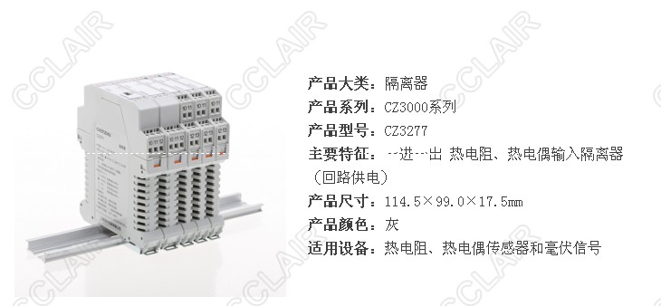CZ3277 一進(jìn)一出 熱電阻、熱電偶輸入隔離器(回路供電) 信號(hào)類型和測量范圍可編程,PT100冷端傳感器,高精度自動(dòng)冷端補(bǔ)償,超量程、斷線檢測與報(bào)警功能。 CZ3278 二進(jìn)二出 熱電阻、熱電偶輸入隔離器(回路供電) 信號(hào)類型和測量范圍可編程,PT100冷端傳感器,高精度自動(dòng)冷端補(bǔ)償,超量程、斷線檢測與報(bào)警功能。