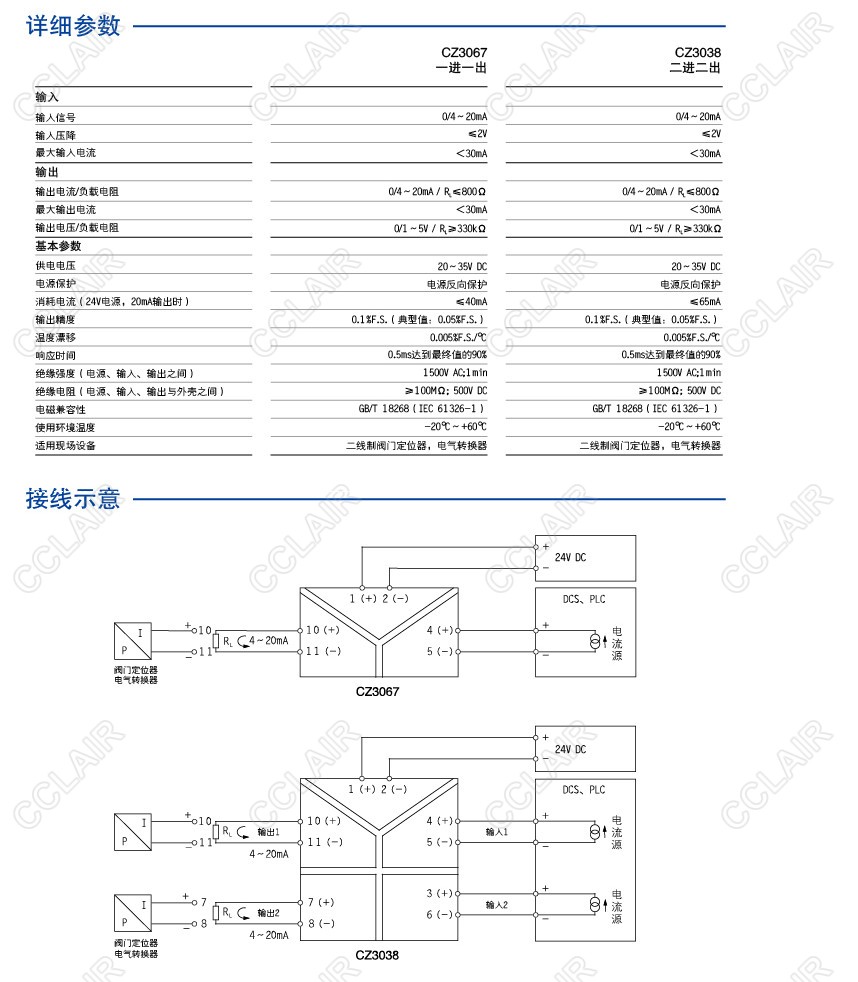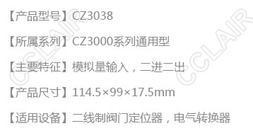 CZ3067 一進(jìn)一出 模擬量輸出隔離器 可驅(qū)動內(nèi)阻高達(dá)800Ω的閥門定位器,4~20mA或0~20mA均保證精度,轉(zhuǎn)換精度高于萬分之五(0.05%F.S.)。 CZ3038 二進(jìn)二出 模擬量輸出隔離器 可驅(qū)動內(nèi)阻高達(dá)800Ω的閥門定位器,4~20mA或0~20mA均保證精度,轉(zhuǎn)換精度高于萬分之五(0.05%F.S.)。