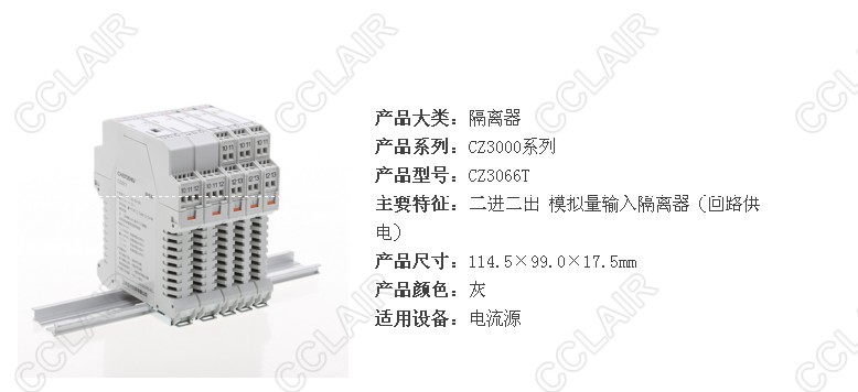 CZ3065T 一進一出 模擬量輸入、輸出隔離器(回路供電) 適用于電流源信號輸入,輸出回路供電,無需獨立電源供電。 CZ3066T 二進二出 模擬量輸入、輸出隔離器(回路供電) 適用于電流源信號輸入,輸出回路供電,無需獨立電源供電.