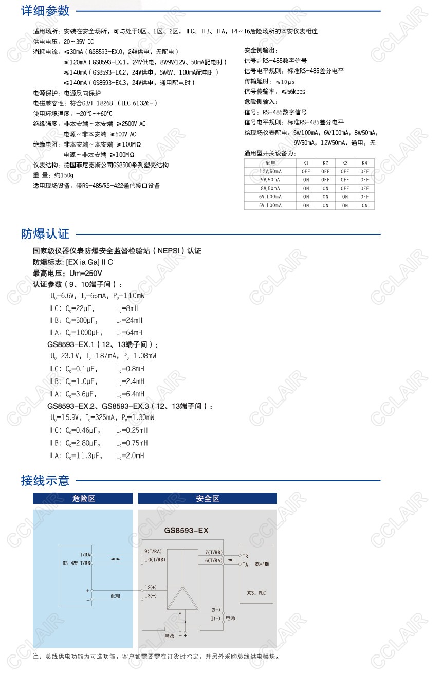 8V/9V/12V、50mA配電;該產(chǎn)品需要獨(dú)立供電,電源、輸入和輸出三隔離。實(shí)現(xiàn)RS-485數(shù)字信號(hào)在危險(xiǎn)區(qū)和安全區(qū)的雙向通信,并給現(xiàn)場(chǎng)儀表提供隔離電源
