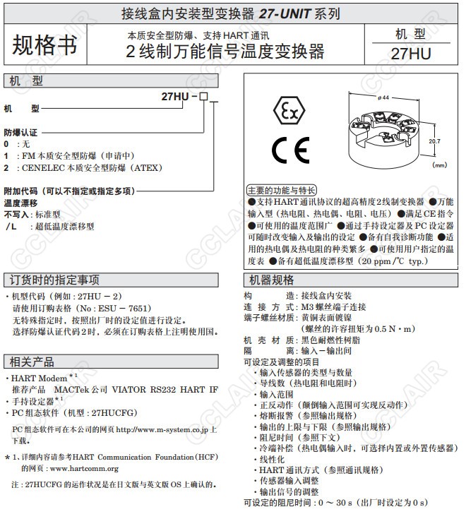 27HU,27HU-0,取得FM,CELENEC本質安全型防爆認證 接線盒內安裝型萬能輸入信號變換器27HU-1,27HU-2