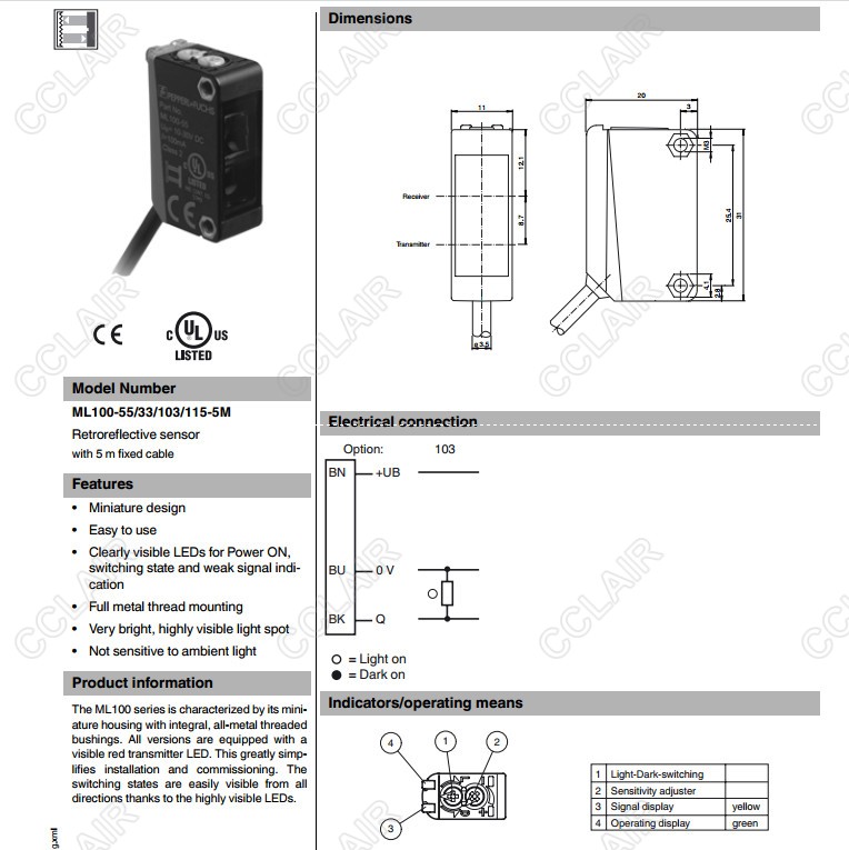 ML100-55/33/103/115-5M,ML100-55/59/103/115,反射板型傳感器