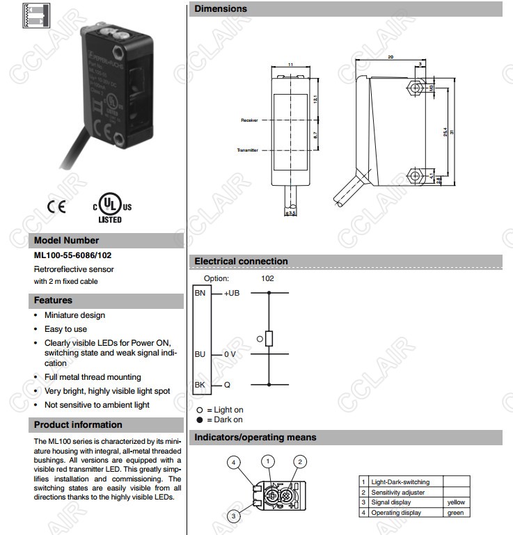 ML100-55-6086/102,ML100-6-IR/102/115,ML100-6-IR/103/115,反射板型傳感器