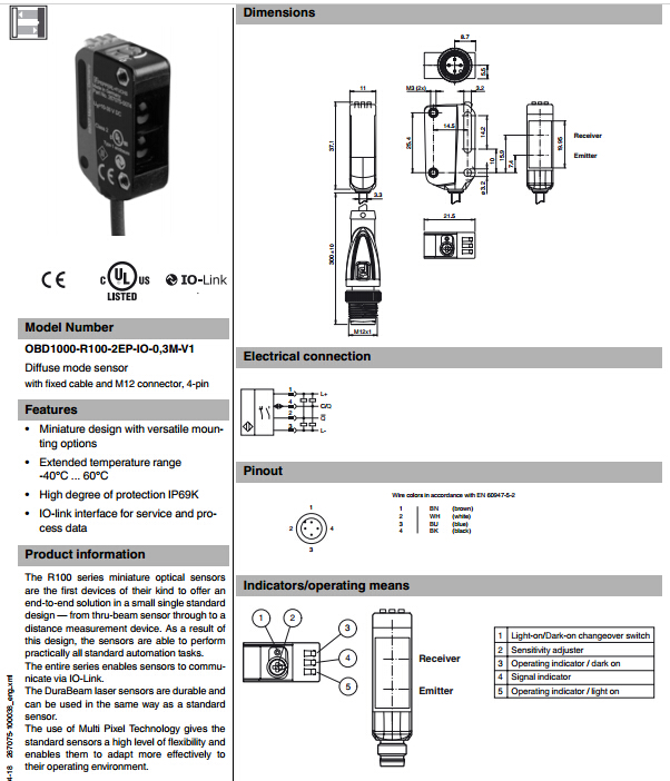 OBD1000-R100-2EP-IO-0,3M-V1,漫反射型傳感器