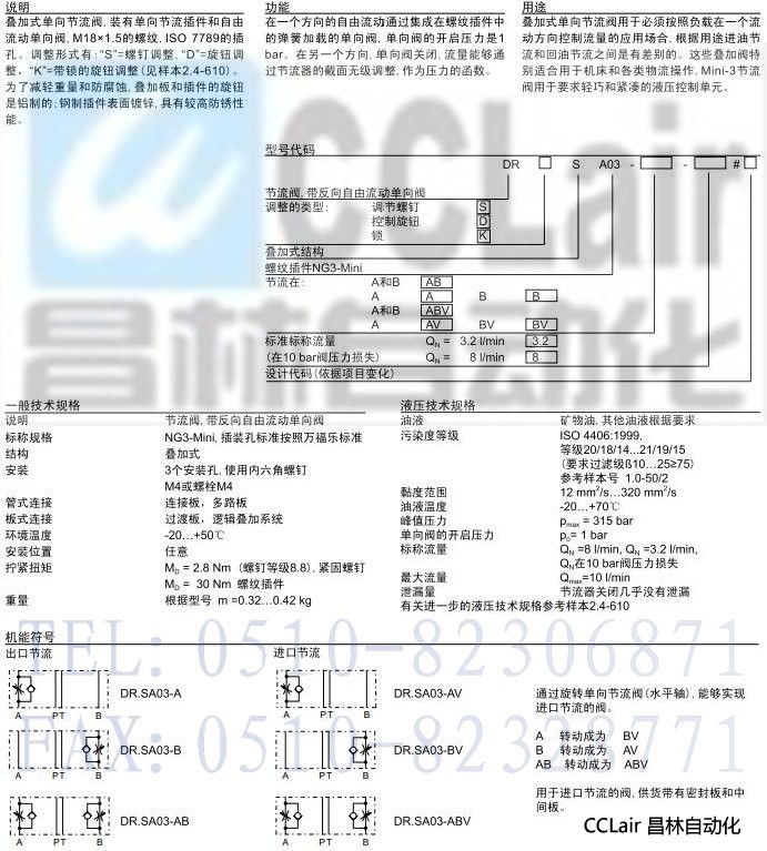 DR.SA03-A,DR.SA03-AB,DR.SA03-B,DR.SA03-AV,疊加式單向節(jié)流閥