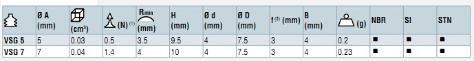 詳細(xì)信息 VSG5,VSG7,COVAL通用吸盤 VSG系列通用吸盤,波紋形2.5褶,Ø5和7mm兩種,材料:丁腈橡膠(NBR),硅膠(SI)。 主要參數(shù)見下表: