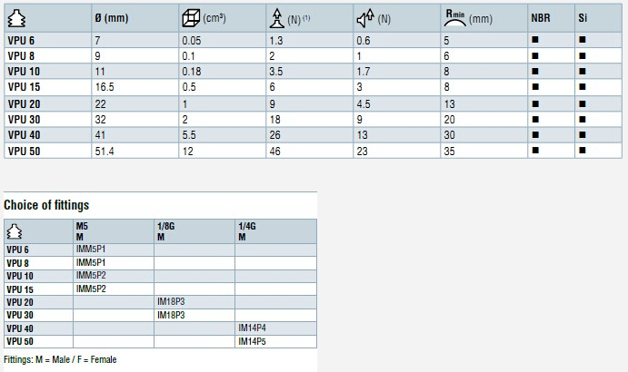 詳細(xì)信息 VPU6,VPU8,VPU10,VPU15,VPU20,VPU30,VPU40,VPU50,COVAL平面吸盤 VPU系列通用平面吸盤,Ø6 - 50mm,材料:丁腈橡膠(NBR),硅膠(SI)。 主要參數(shù)見(jiàn)下表: