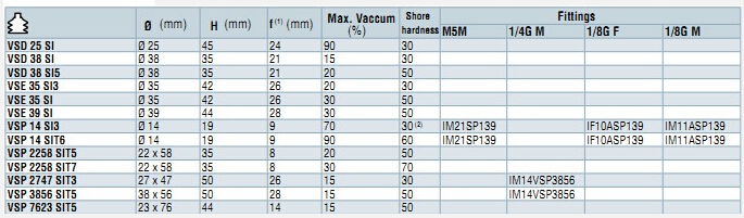 詳細(xì)信息 VSD25SI,VSD38SI,VSD35SI,VSD39SI,VSD14SI3,VSD2258SIT5,VSD2747SIT3,VSD3856SIT5,VSD7623SIT5,COVAL吸盤 VSD_VSE_VSP系列吸盤,特別為食品生產(chǎn)專門設(shè)計,材料:硅膠(SI),半透明硅膠(SIT),有多種形狀和硬度可選擇,使用溫度:-40~220℃。 主要參數(shù)見下表: