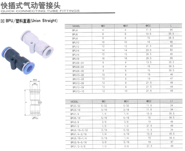 BPU4,BPU6,BPU8,BPU10,BPU12,BPU14,BPU15,BPU16,BPEU5/32,BPU3/16,BPU1/4,BPU5/16,BPU3/8,BPU1/2,快插式氣動(dòng)管接頭
