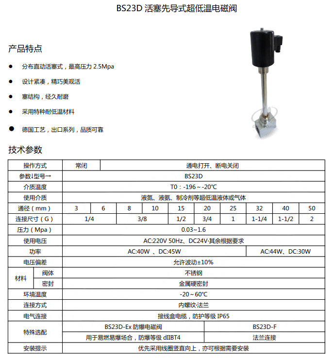 BS23D-DN3,BS23D-DN6,BS23D-DN8,BS23D-DN10,活塞先導式超低溫電磁閥