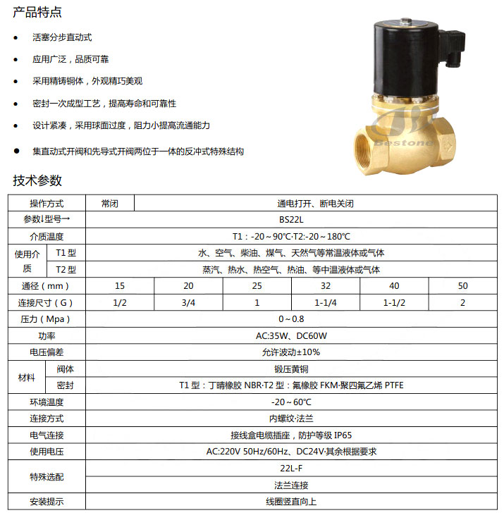 BS22L-DN15,BS22L-DN20,BS22L-DN25,BS22L-DN32,BS22L-DN40,BS22L-DN50,活塞分步直動式黃銅電磁閥