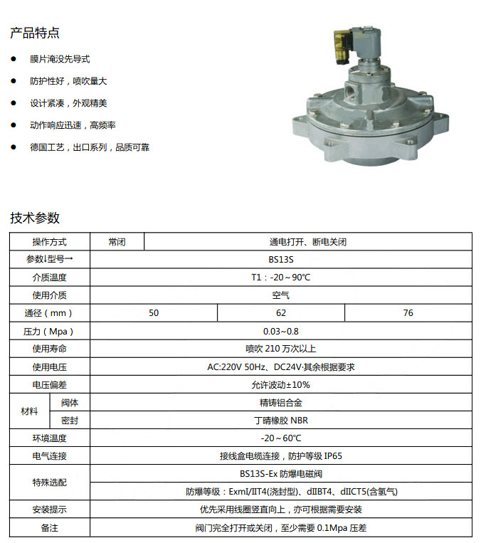 詳細(xì)信息 BS13S-DN50,BS13S-DN62,BS13S-DN76,膜片先導(dǎo)淹沒式脈沖電磁閥