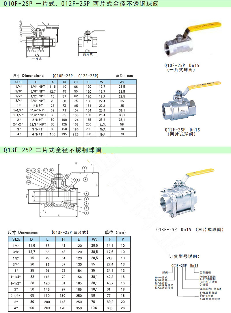 Q10F-25P-DN15,Q12F-25P-DN20,Q13F-25P-DN25,兩片式全徑不銹鋼球閥