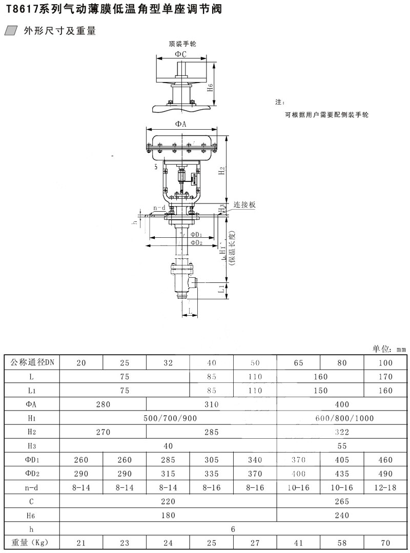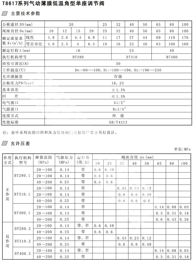 T8617-16-DN20,T8617-16-DN65,T8617-25-DN32,T8617-25-DN100,氣動薄膜低溫角型單座調節(jié)閥