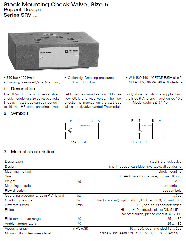 詳細(xì)信息 SRV-P-10-05,SRV-P-10-10,SRV-P-10-30,SRV-P-10-40,SRV-P-10-60,SRV-P-10-80,Bucher疊加閥