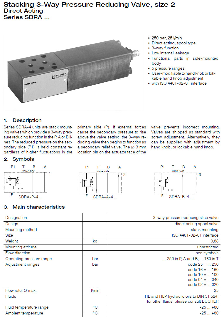 SDRA-A-4-25,SDRA-P-4-16,SDRA-A-4-25,SDRA-B-4-04,SDRA-A-4-10,Bucher減壓閥
