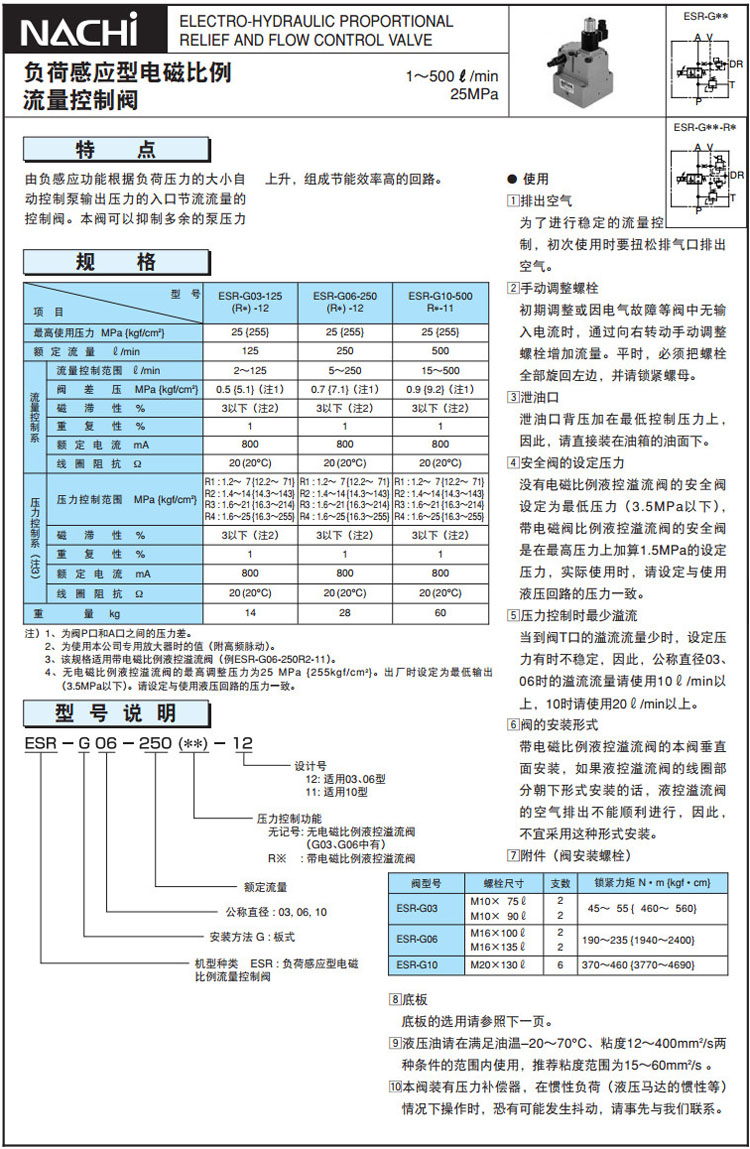 詳細(xì)信息 ESR-G03,ESR-G06,ESR-G10,ESR-G03-125-12,ESR-G06-250R1-12,ESR-G10-500R2-11,NACHI電磁比例流量控制閥