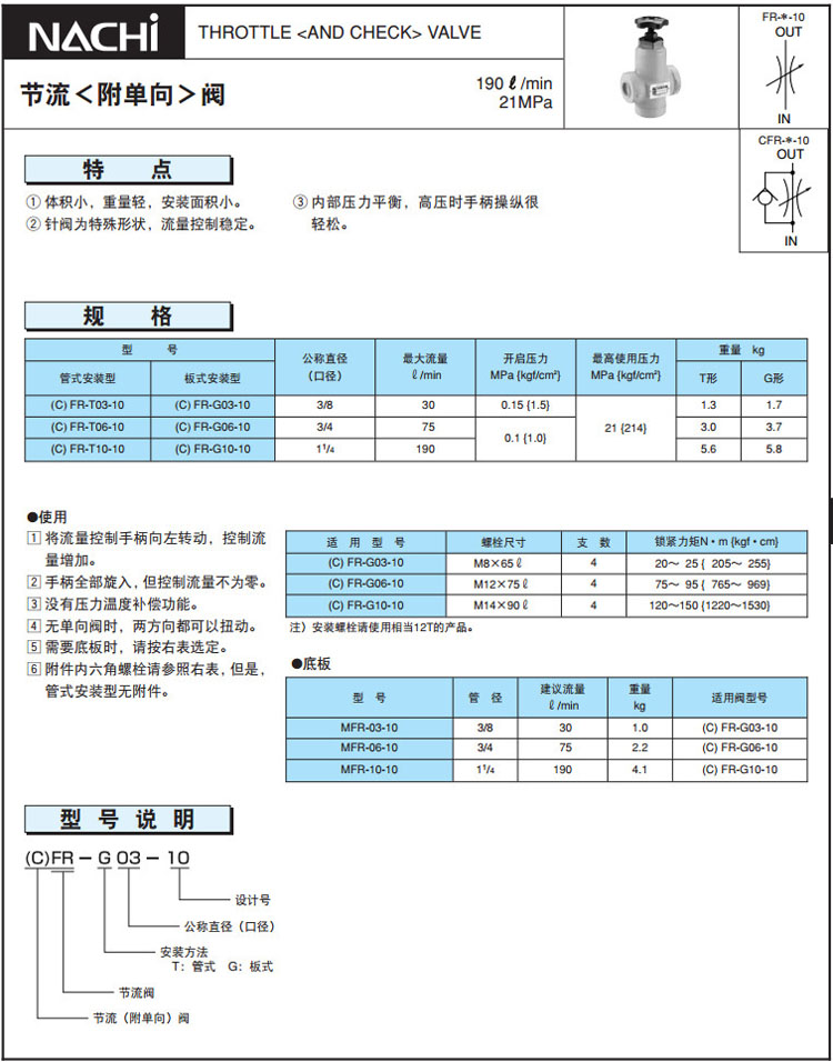 CFR-T03-10,CFR-T06-10,CFR-T10-10,CFR-G03-10,CFR-G06-10,CFR-G10-10,NACHI節(jié)流附單向閥